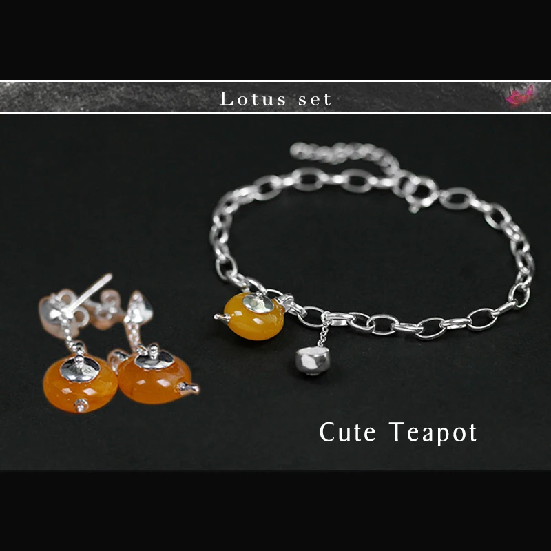 BEST Lotus Fun Real 925 Sterling Silver Natural Amber Handmade Fine Jewelry Cute Teapot Jewelry Set with